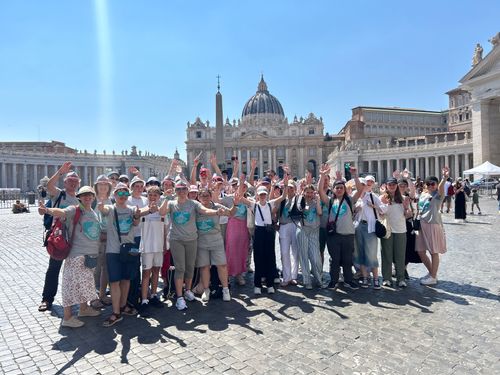 Aufgebrochen in die Stadt haben wir uns einmal das Pilgerzentrum angeschaut, in dem es viele kleine Stände und Aktionen zu erleben gab. Lange konnten wir dort allerdings nicht bleiben, denn der Petersplatz öffnete schon bald seine Tore für die Papst-Audienz. Für gute Plätze musste man früh kommen und das haben wir gemacht und mussten dann bei fast 40 °C und praller Sonne ein paar Stunden warten, bis es losging. Die Zeit verging wie im Flug, denn es gab eine Menge zu sehen.
